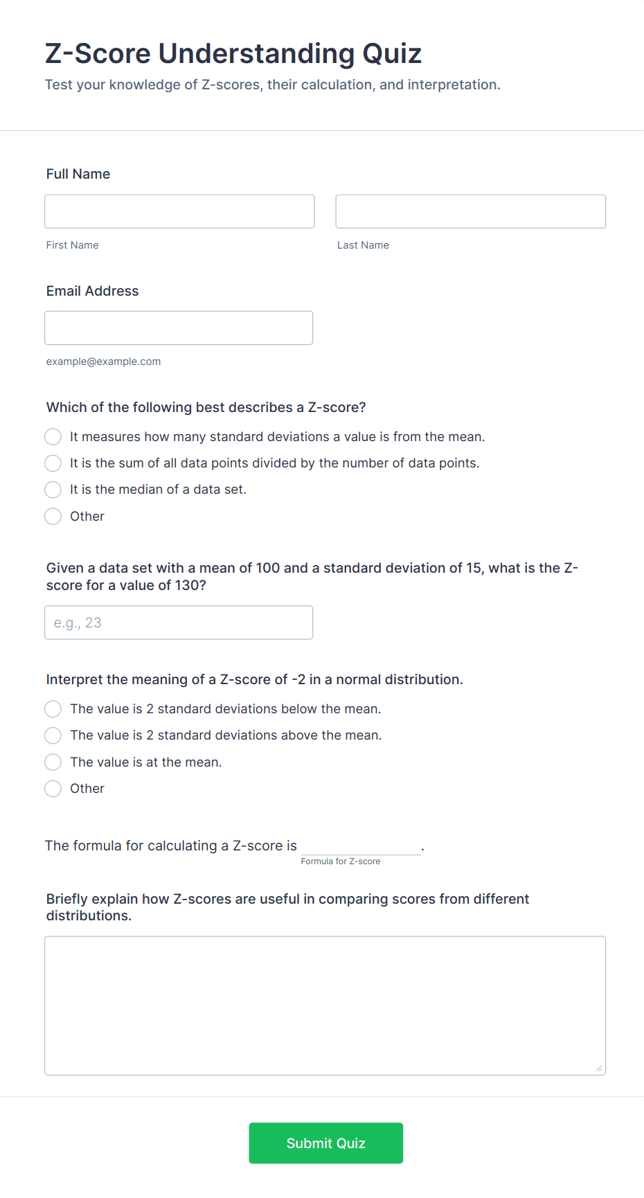 Quiz Templates are pre-designed forms specifically created to facilitate the process of building quizzes for a variety of purposes, such as education, employee training, lead generation, event engagement, and more. These templates provide a structured way to present questions, collect answers, and automatically score or evaluate responses. Whether you’re a teacher assessing student knowledge, a business running a product knowledge test, or a marketer creating a fun personality quiz, Quiz Templates offer a flexible foundation to suit your needs. They can be used for online exams, trivia games, onboarding assessments, customer feedback quizzes, and interactive learning modules.