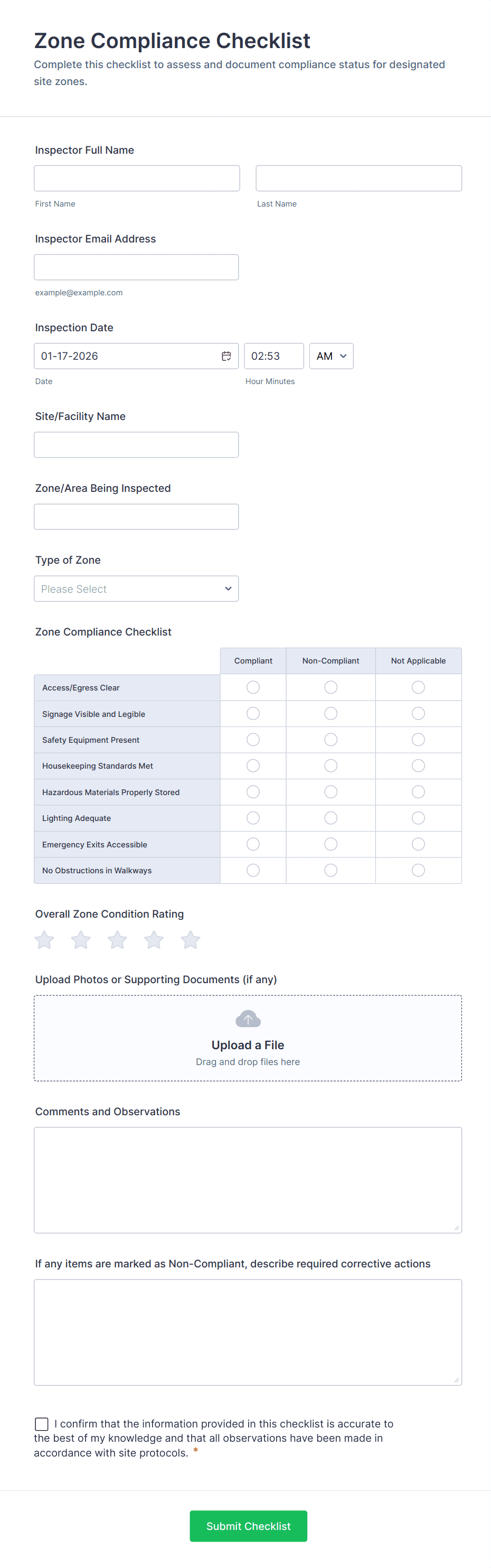 • Dropdowns or multiple-choice fields: For compliance status (e.g., Pass/Fail, Satisfactory/Unsatisfactory)