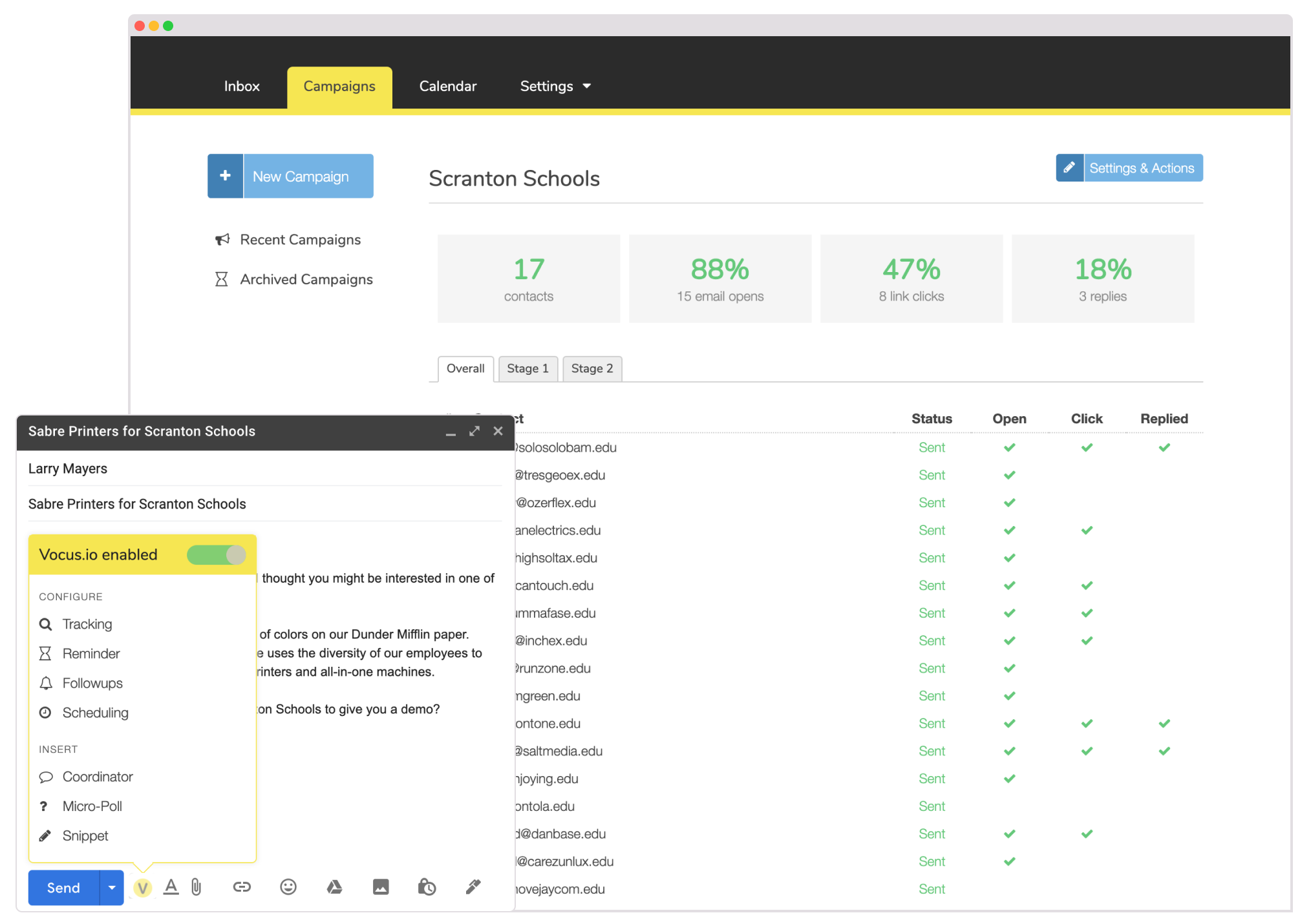 Vocus.io va également au-delà de la planification en tant que plate-forme de diffusion par e-mail. Vous pouvez personnaliser vos campagnes d’emailing, suivre et automatiser l’envoi d’e-mails, synchroniser avec les systèmes CRM et collaborer avec votre équipe, le tout avec une seule solution logicielle.