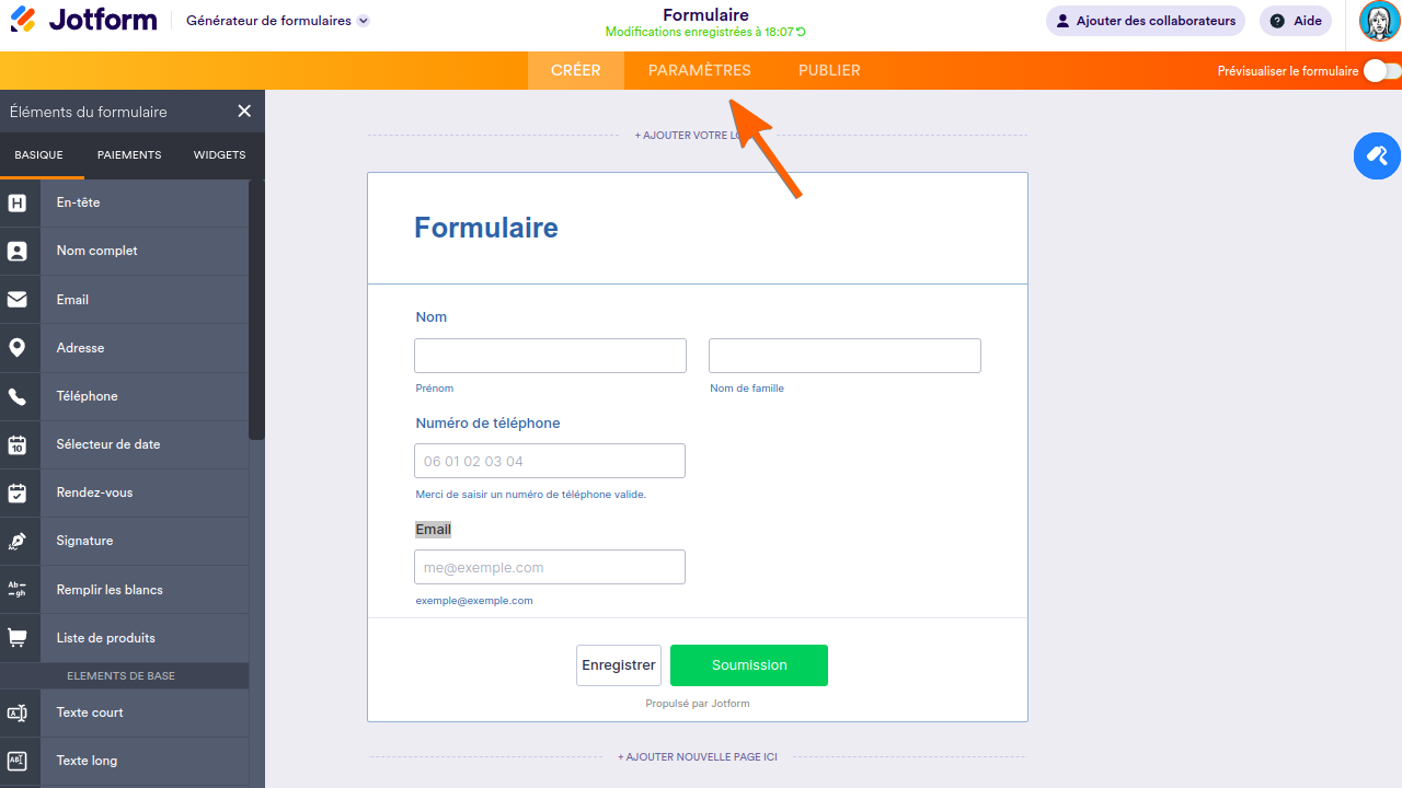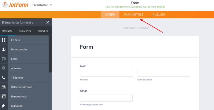 Pour ajouter l’intégration, accédez à l’onglet Paramètres dans le Générateur de Formulaire de Jotform.