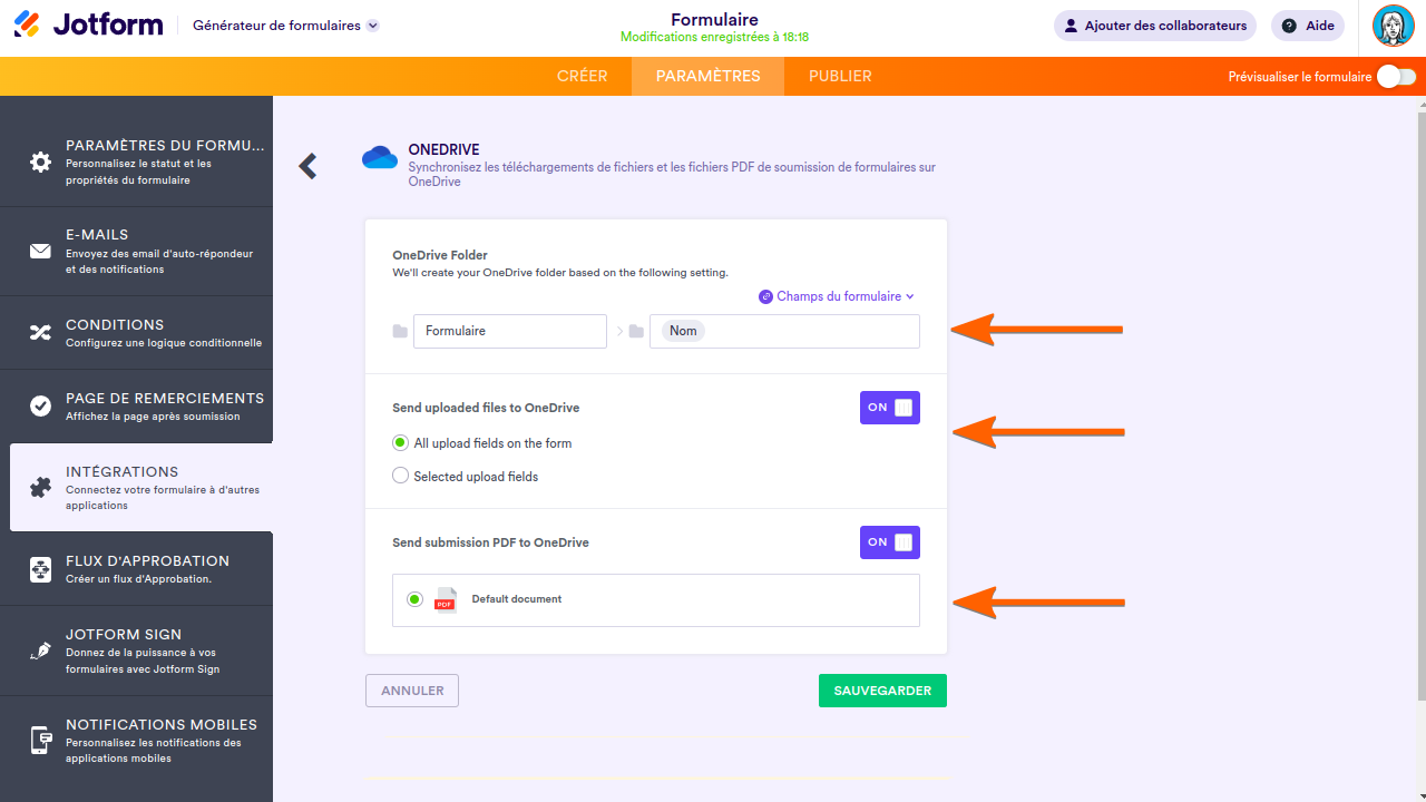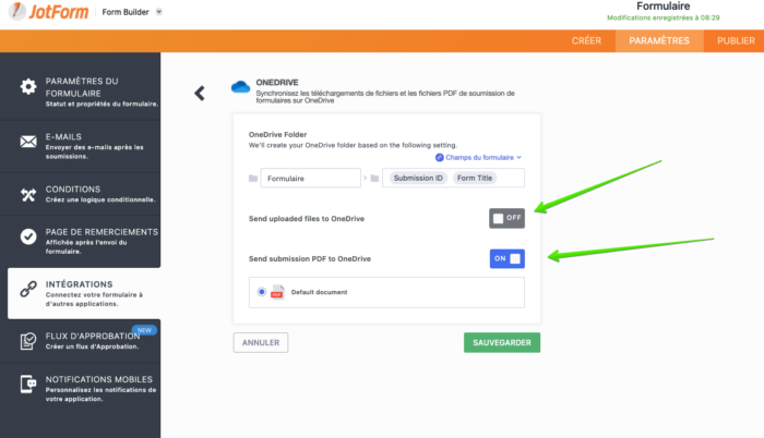 Microsoft OneDrive vous permet de partager des documents, des vidéos, des photos et bien davantage, en ligne, avec un simple lien. Vous pouvez désormais envoyer les fichiers téléchargés sur votre formulaire en ligne et les fichiers PDF des soumissions de formulaires à OneDrive via notre intégration.