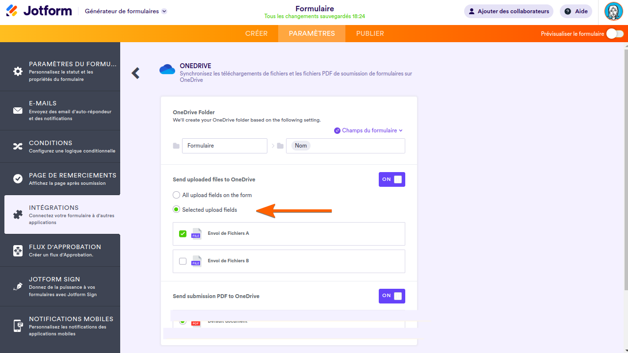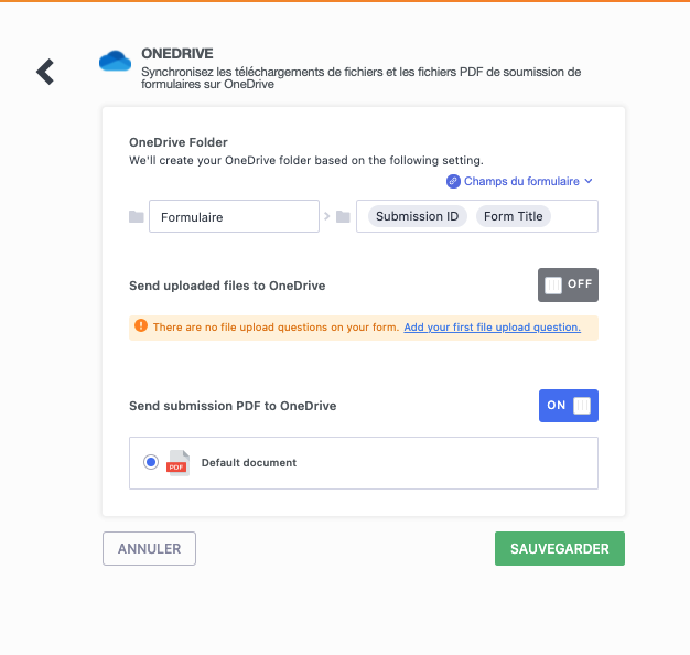 L’intégration créera automatiquement un nouveau dossier OneDrive (dans votre compte OneDrive). Dans les préférences d’intégration, vous pouvez indiquer si vous souhaitez téléverser des fichiers dans OneDrive à partir de certains champs de votre formulaire ou de tous les champs de formulaire. Vous pouvez également envoyer automatiquement des versions PDF des soumissions à OneDrive.