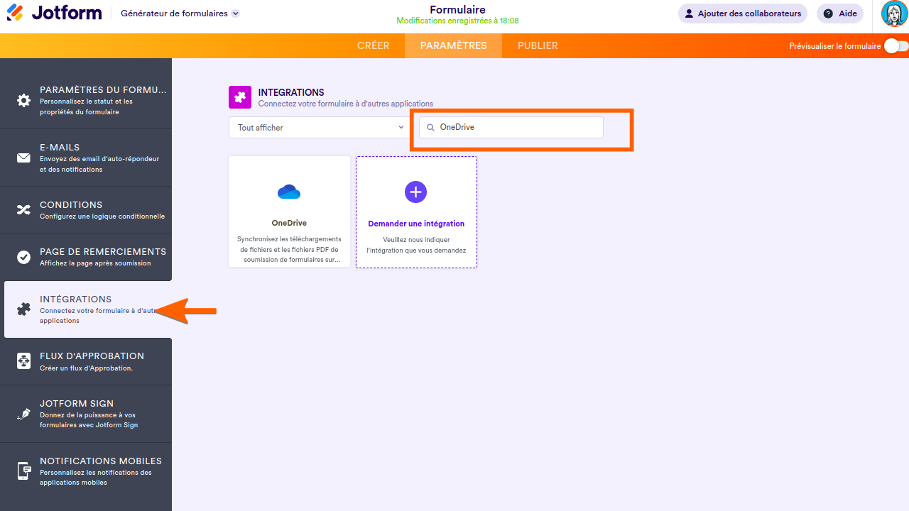 Cliquez ensuite sur Intégrations à gauche. Tapez ensuite OneDrive dans la barre de recherche en haut.