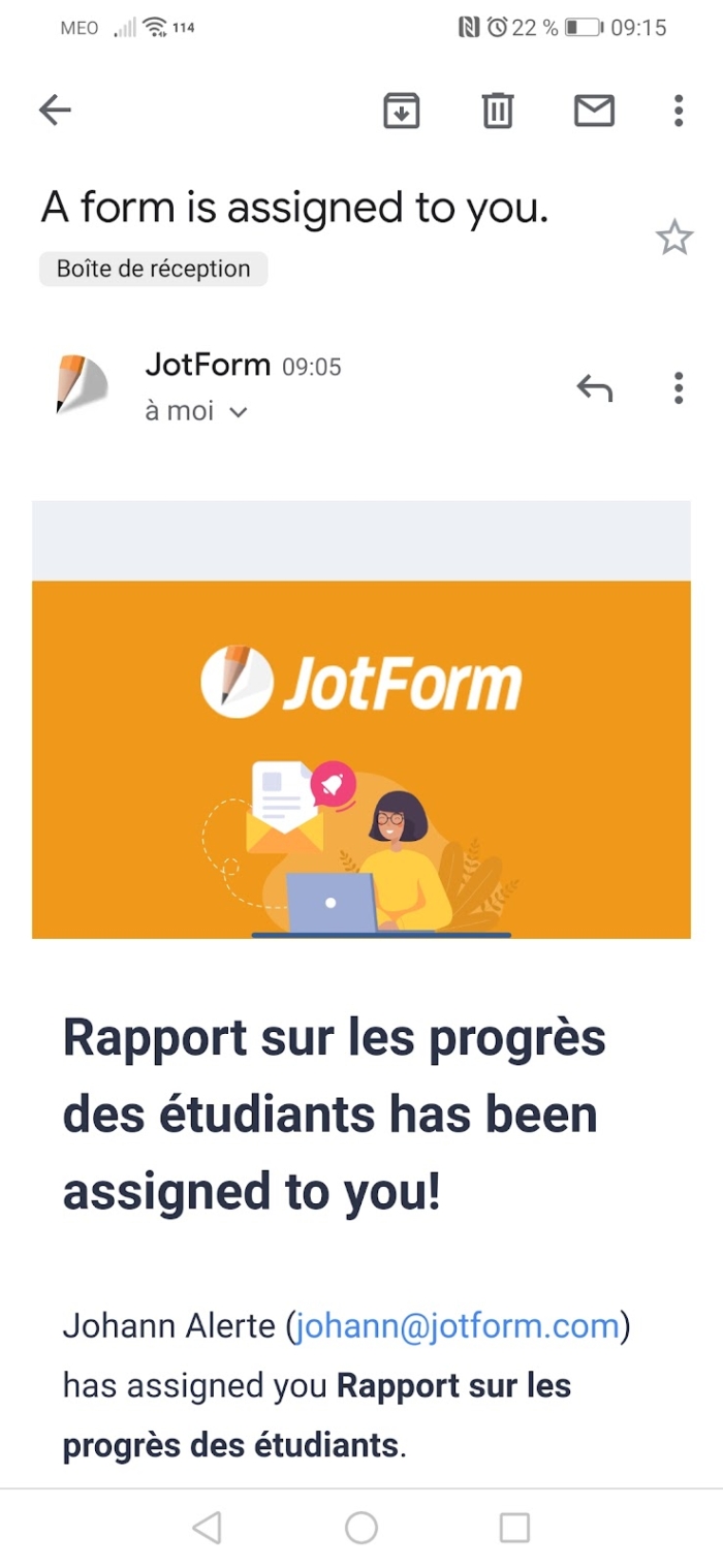 Lorsque vous assignez un formulaire par email via notre générateur de formulaires, les destinataires seront automatiquement affectés à un formulaire une fois qu’ils auront cliqué sur le lien contenu dans l’email qui les renvoie vers le formulaire. Si vous assignez des personnes à un formulaire par e-mail via Jotform Mobile Forms, elles devront toujours télécharger l’application et fournir leurs informations de connexion temporaires pour accéder au formulaire.