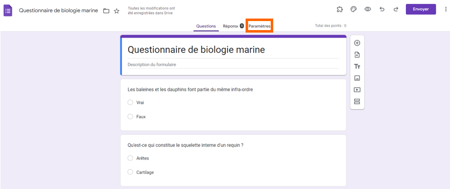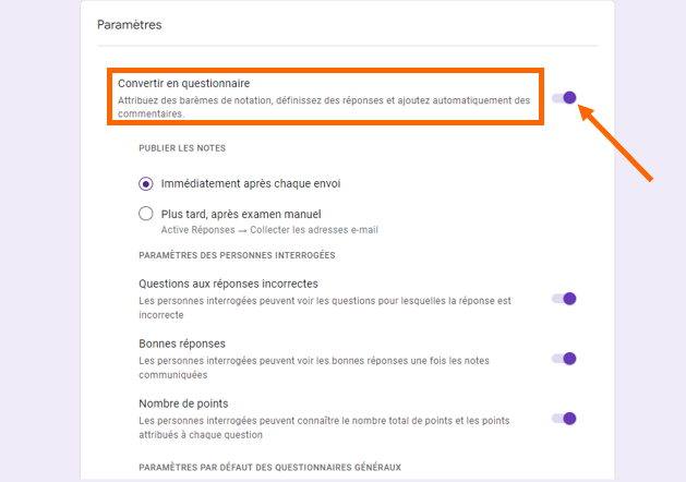 - Pour transformer votre formulaire Google en questionnaire, cliquez sur Paramètres en haut du formulaire et activez le bouton « Convertir en questionnaire ».