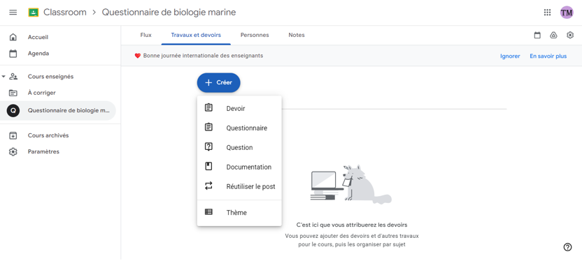 - Une fois que votre questionnaire vous convient parfaitement, accédez à Google Classroom. Cliquez sur l’onglet Classroom, puis sur le bouton Créer et choisissez Travaux et devoirs pour créer un nouveau devoir.