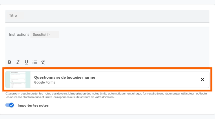 - Si les enseignants souhaitent importer les notes d’un questionnaire de Google Forms vers Google Classroom, ils ne peuvent pas modifier les paramètres du formulaire ni apporter de modifications au devoir après sa création et sa publication. De plus, ils ne peuvent pas importer les notes des élèves s’ils partagent le formulaire par lien dans Google Classroom au lieu de l’ajouter en suivant les étapes indiquées précédemment. Les élèves ne peuvent également soumettre qu’une seule réponse en utilisant une adresse email qui appartient au même domaine que celui de l’enseignant. En d’autres termes, s’ils utilisent l’adresse email de leur établissement, ils ne peuvent soumettre qu’une seule réponse.