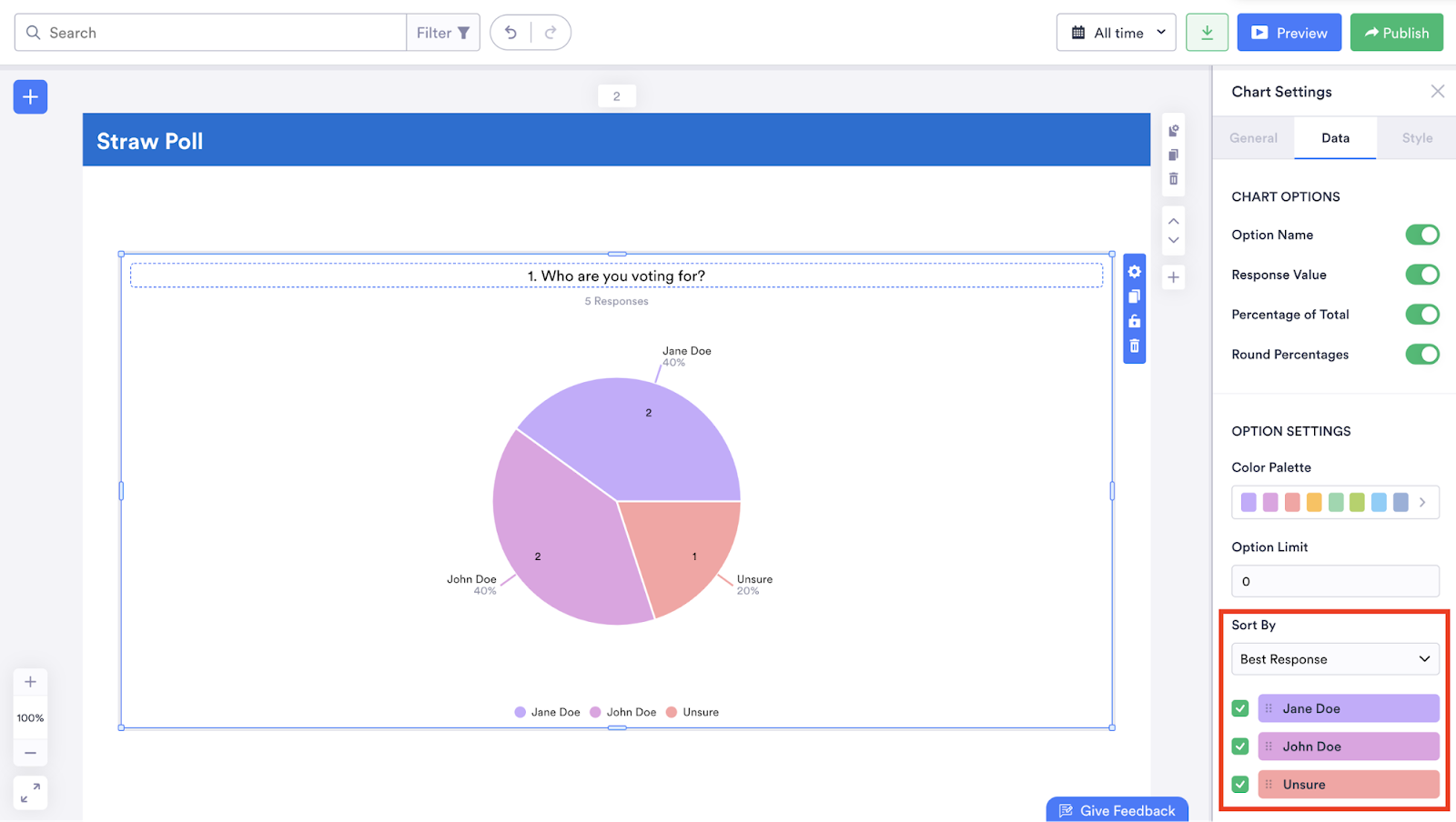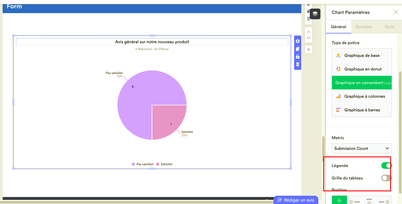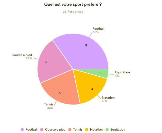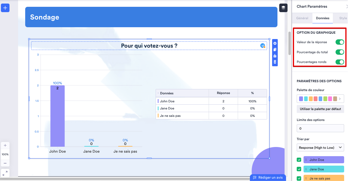 En plus de pouvoir changer le type de graphique utilisé dans votre rapport, vous pouvez également faire figurer combien de personnes ont répondu à une question, combien de personnes ont sélectionné une réponse spécifique et illustrer comment les réponses sélectionnées à une question représentent un certain pourcentage de toutes les réponses.