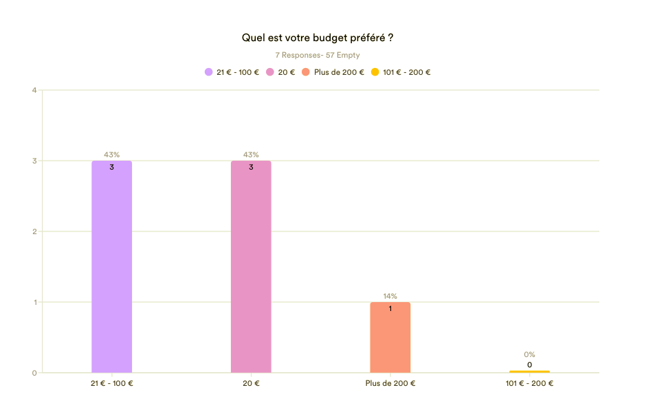 - Données d’intervalle. L’utilisation de questions d’intervalle peut être utile pour segmenter vos clients en groupes, afin que chaque groupe reçoive des questions pertinentes. Par exemple, vous pouvez poser une question sur leur budget de référence, avec des réponses potentielles répertoriant des montants prédéterminés : ‘<20€’, ‘21€ – 100€’ ‘101€ – 200€’ et ‘201€+’. Lorsque les intervalles sont de taille égale, vous pouvez calculer les moyennes des données pour recouper et résumer les informations.