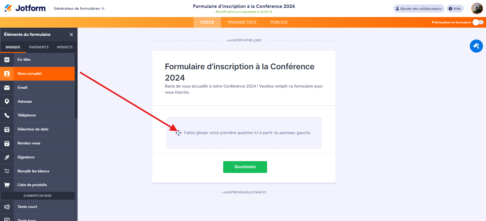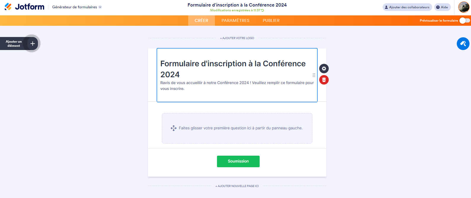 Créer un formulaire d’inscription avec Jotform est un processus rapide et facile. Suivez ces quelques étapes pour utiliser le Générateur de formulaires par glisser-déposer et concevoir votre formulaire en quelques minutes.