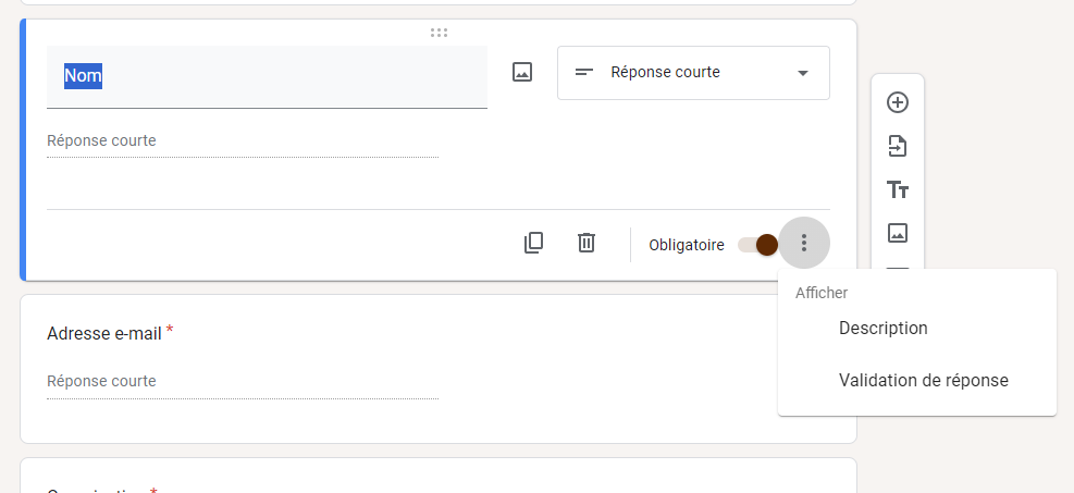 - Pour vous assurer de recevoir des informations précises pour chaque question, vous pouvez configurer l’option de Validation de réponse en cliquant sur les trois points verticaux dans le coin inférieur droit. Avec cette option vous pouvez définir certains critères de réponse et éviter ainsi les réponses inexactes.