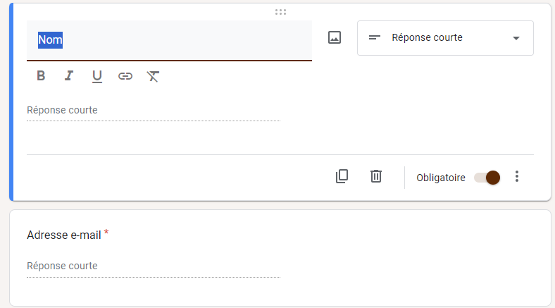 - Pour vous assurer que les répondants ne laissent pas de champs importants vides, activez l’option Obligatoire située dans le coin inférieur droit de chaque question nécessitant une réponse.