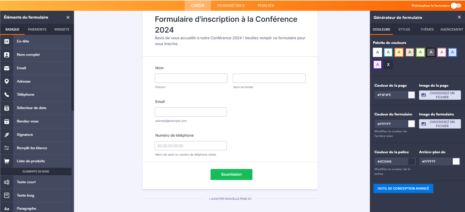 - Utilisez le Générateur de formulaires pour modifier les polices, les couleurs, les thèmes et bien d’autres éléments de votre formulaire.