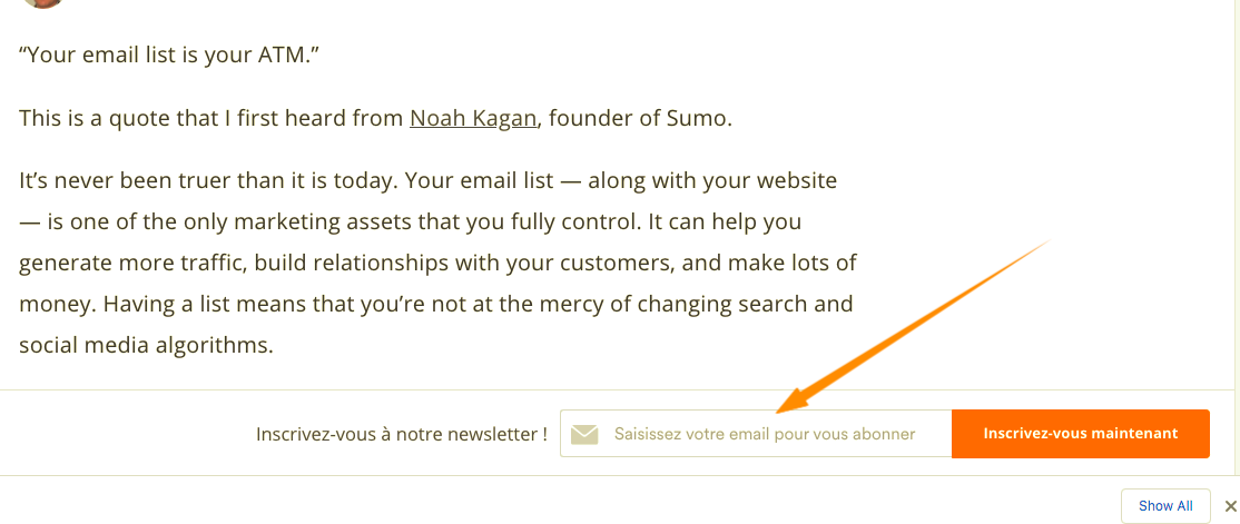 Les pop-ups présentent l’inconvénient d’avoir mauvaise réputation et de souvent embêter les gens. Cependant, elles fonctionnent, surtout si elles sont bien rédigées, incluent une offre convaincante, n’occupent pas l’intégralité de la page (en particulier sur mobile) et sont faciles à cliquer.