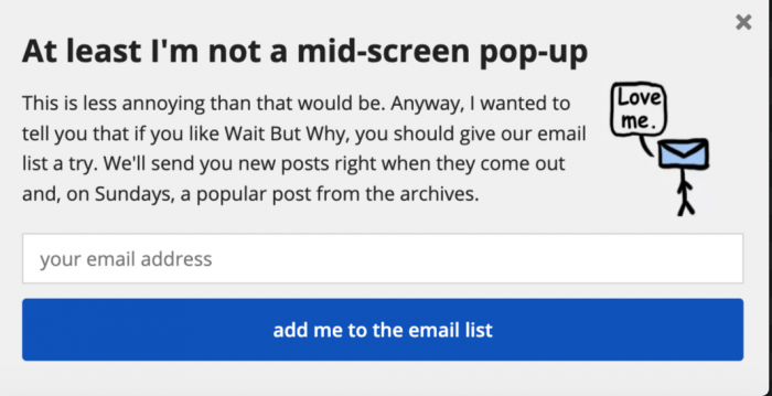 Par exemple, Wait But Why fait un excellent travail en proposant des popups qui convertissent bien mais restent concentrées sur la marque.