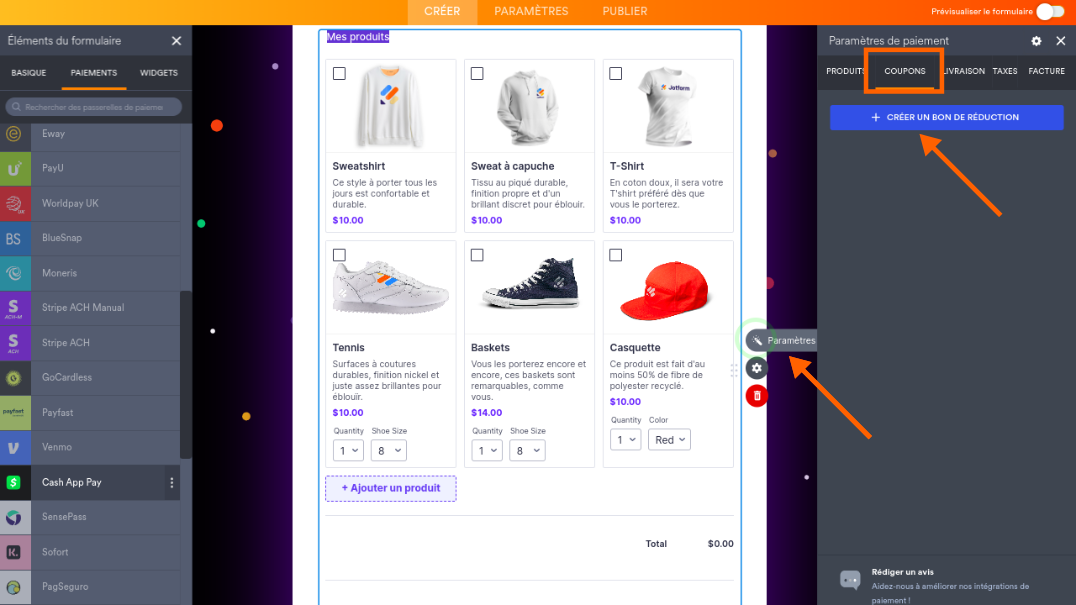 La fonctionnalité de bon de réduction vous permet de créer des codes de réduction personnalisés, lesquels permettent d’appliquer automatiquement des remises (un pourcentage ou un montant fixe). Vous pourrez ensuite appliquer une logique conditionnelle pour appliquer des taxes, calculer le total dû, et connecter votre formulaire avec un processeur de paiement.