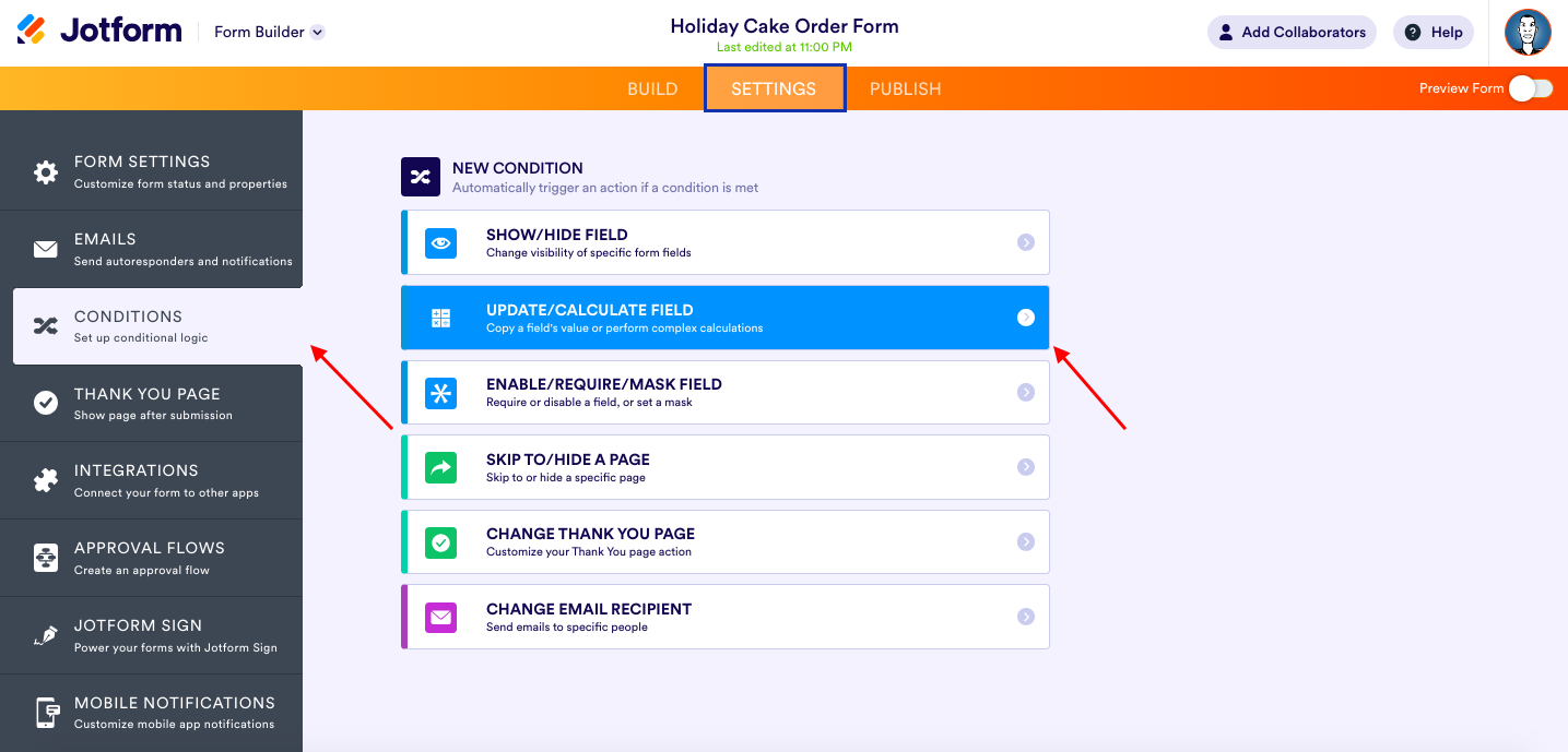 Pour utiliser la logique conditionnelle dans ce cas, accédez simplement aux options Conditions , sous Paramètres , dans le générateur de formulaires. Dans la liste des conditions, sélectionnez Mettre à jour/Calculer le champ .