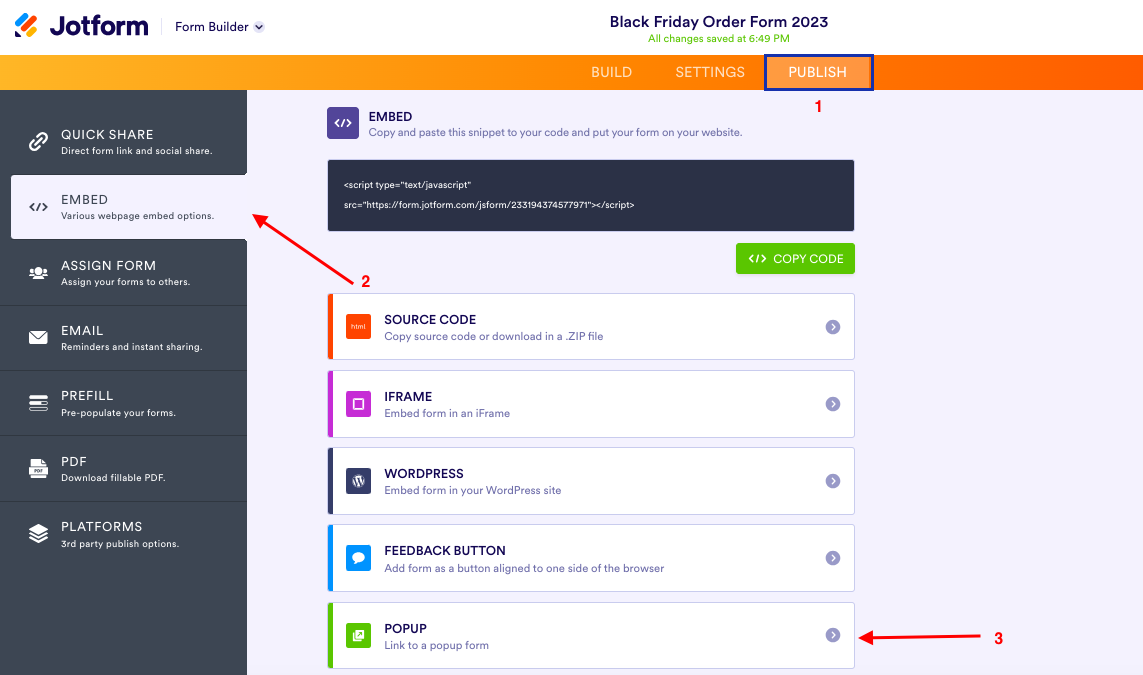 Accédez simplement à la section Publier > Intégrer du générateur de formulaires pour prévisualiser et/ou copier le code HTML afin d’intégrer la pop-up dans votre site web.