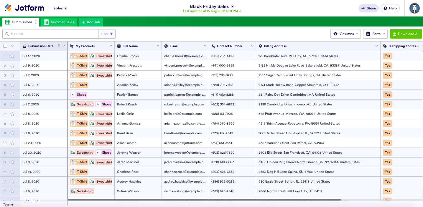 De plus, les Tableaux Jotform fonctionnent comme une feuille de calcul, ce qui vous permet de :