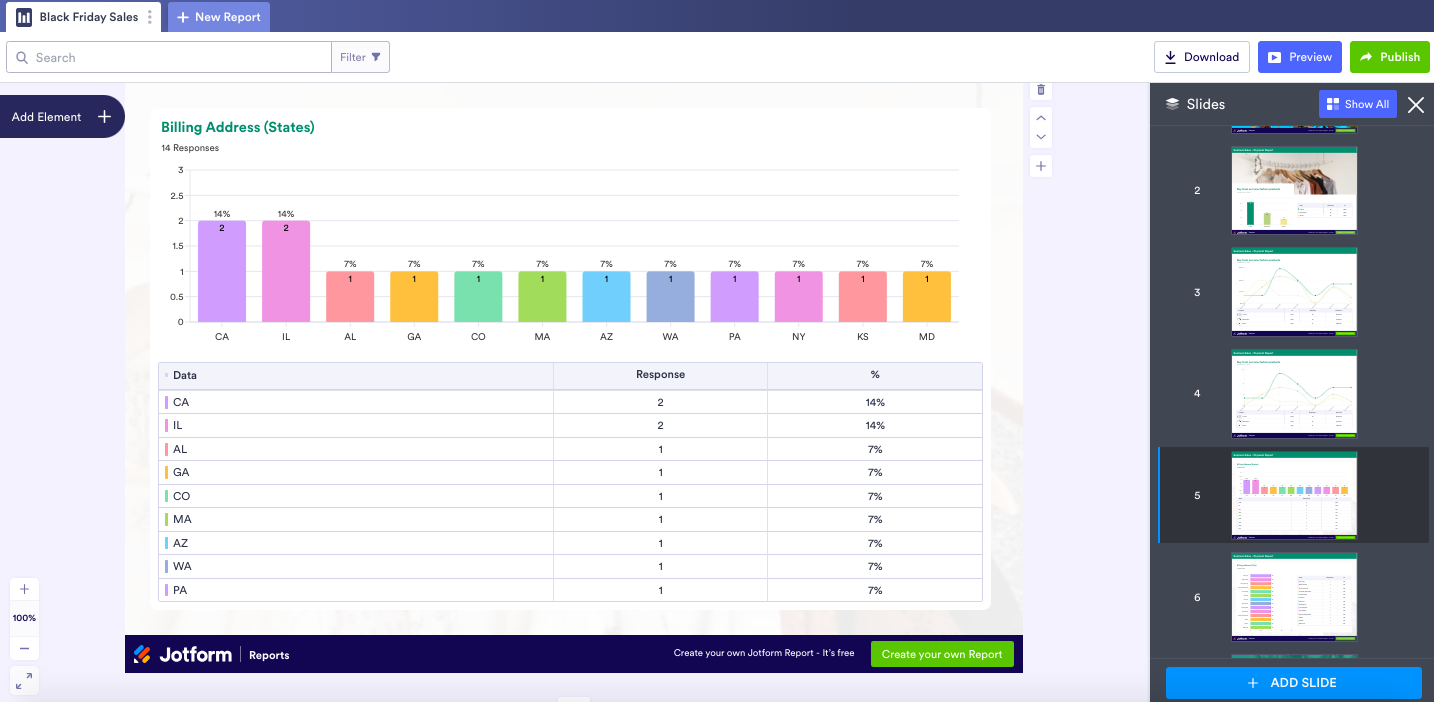 Le générateur de rapports de Jotform vous permet de visualiser toutes les données que vous avez collectées au cours de votre campagne dans un format lumineux, professionnel et prêt à être présenté.
