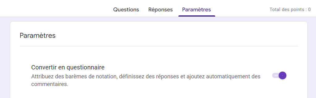 Cliquez sur l’onglet Paramètres, puis basculez le bouton Convertir en questionnaire de façon à l’activer.