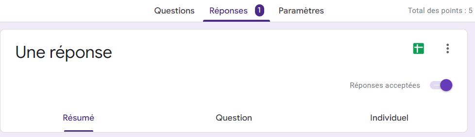 Dans le coin supérieur droit de la page, il y a une icône de feuille de calcul verte à côté de l’icône à trois points. Ce bouton vous permettra d’exporter toutes vos données vers une feuille de calcul Google Sheets. Vous pouvez utiliser la feuille de calcul pour calculer une courbe de notation à l’aide des données de votre questionnaire ou gérer autrement vos données.
