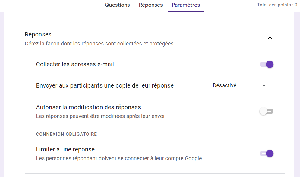 Ensuite, activez l’option Collecter les adresses e-mail et définissez votre quiz sur Limiter à 1 réponse. L’activation de ces deux paramètres réduira la possibilité de tricherie.