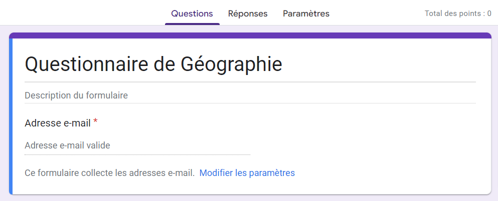 Vous pouvez également ajouter une description du questionnaire sous le titre. Le champ e-mail est à remplir par vos élèves.