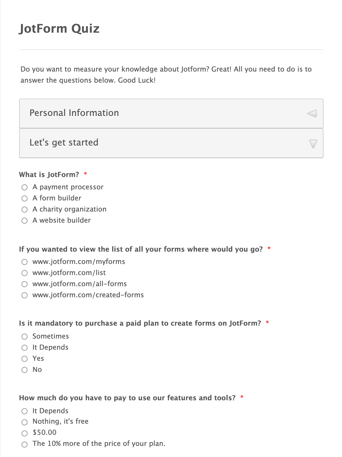 Qui plus est, il est facile de se lancer avec Jotform. Il vous suffit d’utiliser notre générateur de questionnaire ou de personnaliser un modèle de questionnaire existant.