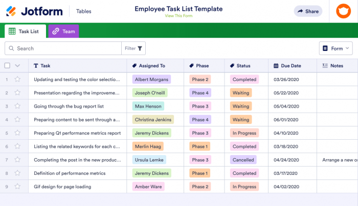 Avec des modèles de tableau prêts à l’emploi tels que la liste des tâches des employés de Jotform, le suivi des tâches et le modèle de liste des tâches liées au projet , vous pouvez facilement organiser un nouveau projet en étapes exploitables. Vous pouvez personnaliser ces modèles pour n’importe quel projet, tandis que des options telles que le modèle de campagne de e-marketing et le modèle de calendrier de e-marketing sont déjà personnalisés et prêts pour des projets spécifiques.