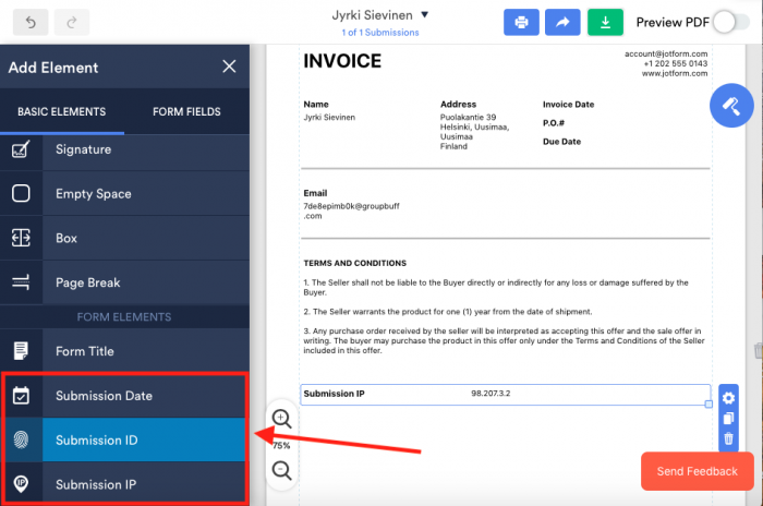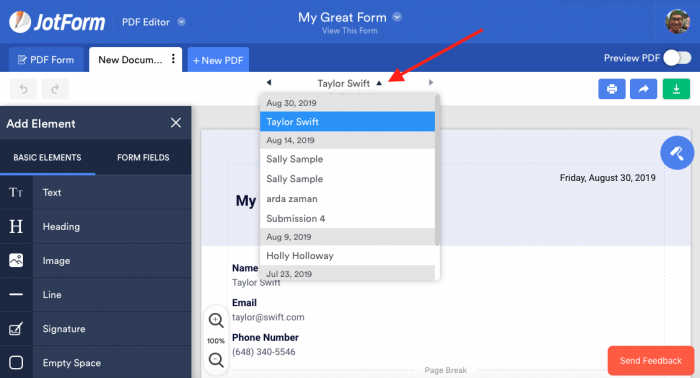Cela vous évite d’avoir à quitter l’Éditeur PDF de Jotform, de devoir parcourir le tableau de bord de votre compte et d’avoir à ouvrir une autre soumission à partir du même formulaire dans l’Éditeur PDF de JotForm. Il est également facile de localiser la soumission que vous souhaitez ouvrir à partir du même formulaire, car la liste déroulante des soumissions dans l’éditeur PDF de Jotform est organisée par date et par ordre dans lequel les formulaires ont été soumis.