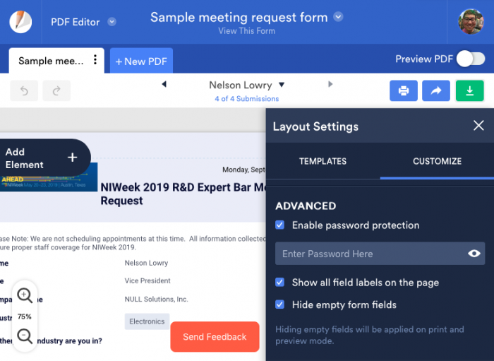 Une fois que vous avez choisi d’envoyer un PDF des réponses soumises au formulaire en tant que pièce jointe à votre email d’auto-répondeur, cliquez simplement sur le document PDF associé au formulaire. Cliquer sur la sélection PDF vous permettra d’ouvrir le document dans l’Éditeur PDF de JotForm. Ensuite, vous pouvez décider si vous souhaitez activer la protection par mot de passe pour le PDF joint à votre email automatique.