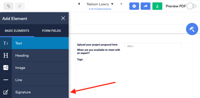 L’éditeur PDF de Jotform vous permet d’inclure plusieurs champs de signature électronique sur votre PDF. Ces champs vides sont automatiquement renseignés lorsque les formulaires liés au document incluent des signatures électroniques.