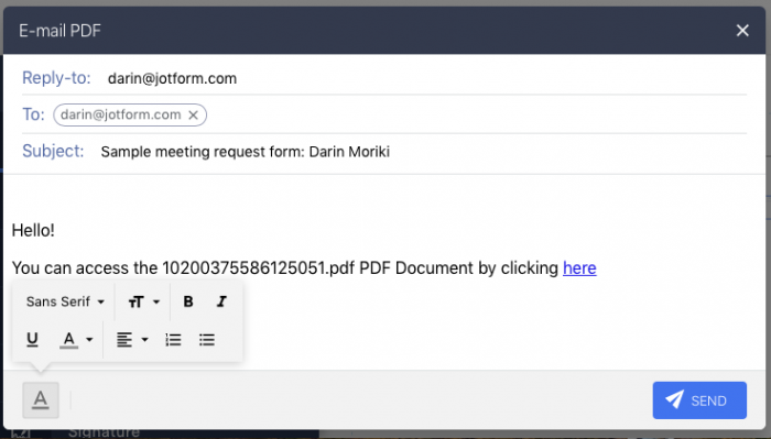 L’Editeur PDF de Jotform vous permet également d’envoyer votre PDF dans un email dédié et de personnaliser le message qui l’accompagne.