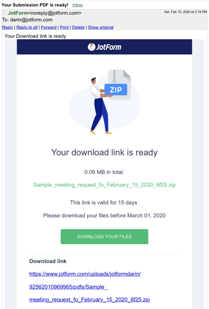 Dans la mesure où votre document personnalisé est lié à un formulaire, toutes les soumissions téléchargées auront le même format tel que prévu dans votre PDF. Toutes les soumissions seront compressées dans un fichier .zip et envoyées à l’adresse email associée à votre compte JotForm.