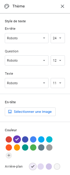 Google Forms offre plusieurs options de personnalisation, comme la modification des palettes de couleurs et le téléchargement d’images. Toutefois, cet outil reste limité à une esthétique simple et standard, typique des solutions Google, ce qui le rend moins adapté pour créer un formulaire véritablement sur mesure.