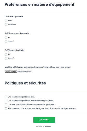 Jotform dispose d’autres modèles de formulaires que vous pourriez inclure dans votre nouveau processus d’intégration employé. Par exemple, vous pouvez demander à chaque employé de remplir un formulaire de contact d’urgence. Ou vous pouvez trouver que poser certaines questions aux nouveaux employés est un bon moyen d’en savoir plus sur chaque personne à des fins de consolidation de l’équipe.