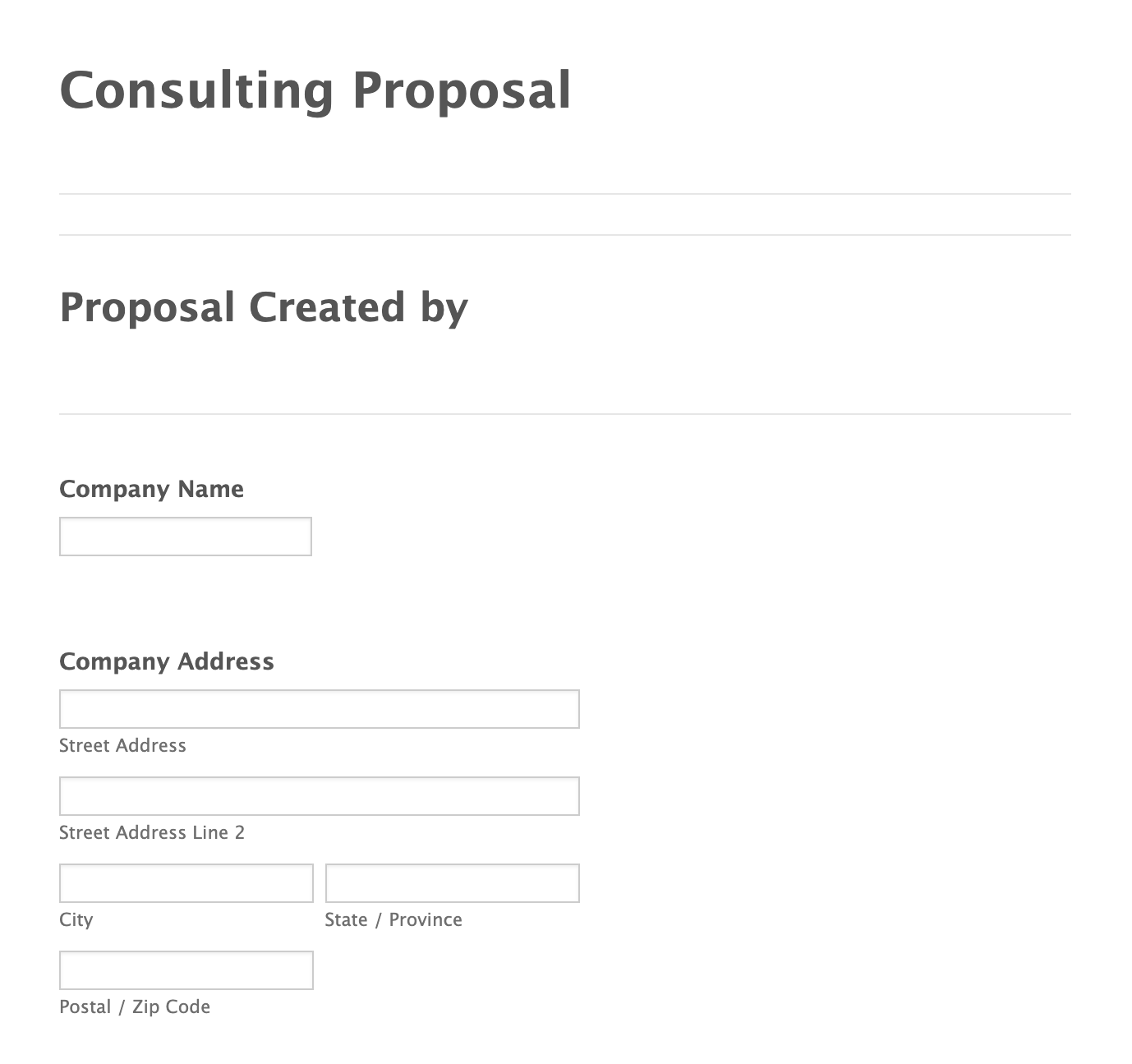 De plus, Jotform propose des modèles de proposition de conseil avec des champs de formulaire concernant l’entreprise et le client, la description du projet, l’historique de l’entreprise, l’objectif, l’étendue des travaux, la date de début, la date d’achèvement, les tarifs de conseil, les conditions de paiement et les signatures. Des modèles de formulaire de proposition d’emploi sont disponibles lorsque vous avez besoin de créer rapidement une proposition d’emploi.