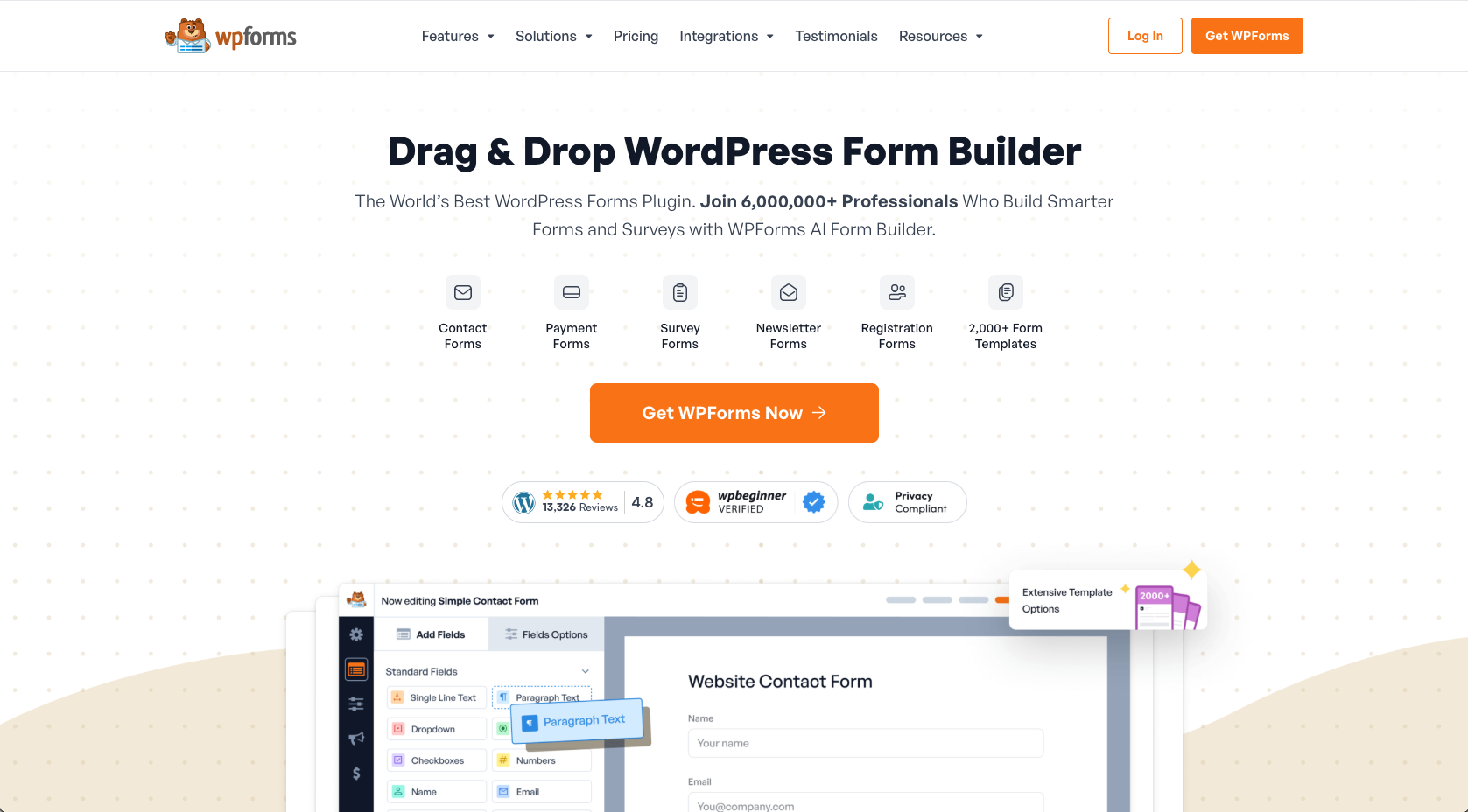 Recommandé pour : Les propriétaires de sites WordPress et blogueurs qui ont besoin de formulaires de contact, paiement ou d’intégration natifs par glisser-déposer sans toucher aux intégrations externes ou au code