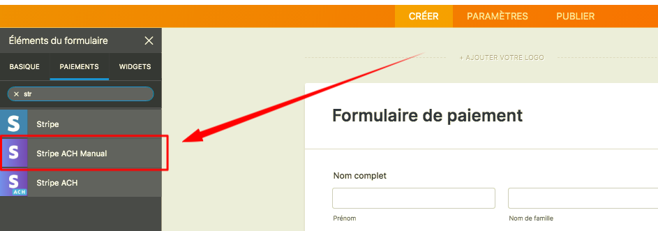 1. Dans le générateur de formulaires, recherchez Stripe ACH sous l’onglet Paiements dans les éléments de formulaire. Cliquez simplement sur l’icône pour l’ajouter à votre formulaire.