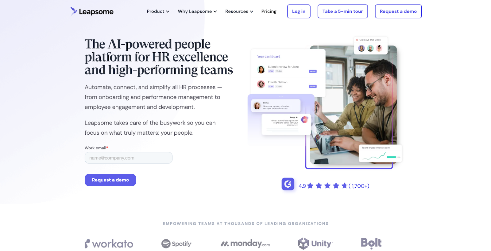 Leapsome est une plateforme RH complète, dédiée à la gestion de la performance, à l’engagement des collaborateurs et au développement des compétences. Conçue pour instaurer une culture du feedback, elle intègre des évaluations à 360 degrés, des enquêtes d’engagement et des analyses alimentées par l’IA. Cette approche en fait une solution idéale pour les entreprises soucieuses de stimuler la croissance et l’implication de leurs équipes.