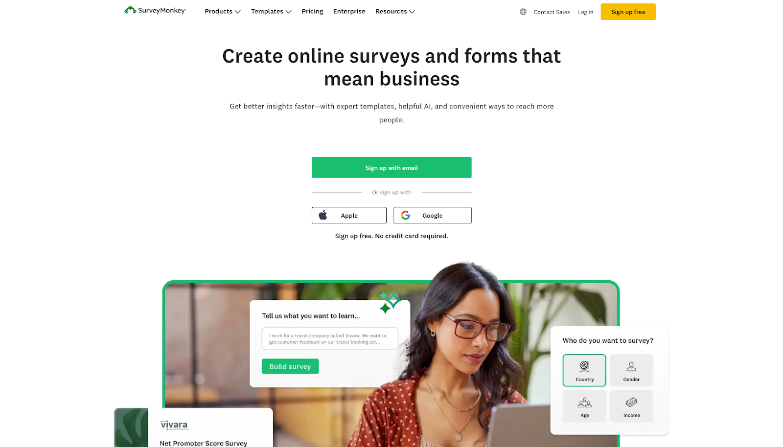 Réputé pour sa polyvalence, SurveyMonkey est un outil d’enquête populaire que les entreprises peuvent utiliser pour créer des formulaires de feedback et des enquêtes d’évaluation des employés. SurveyMonkey propose des modèles d’enquête personnalisables, plusieurs types de questions, des tableaux de bord personnalisés et des analyses automatisées.