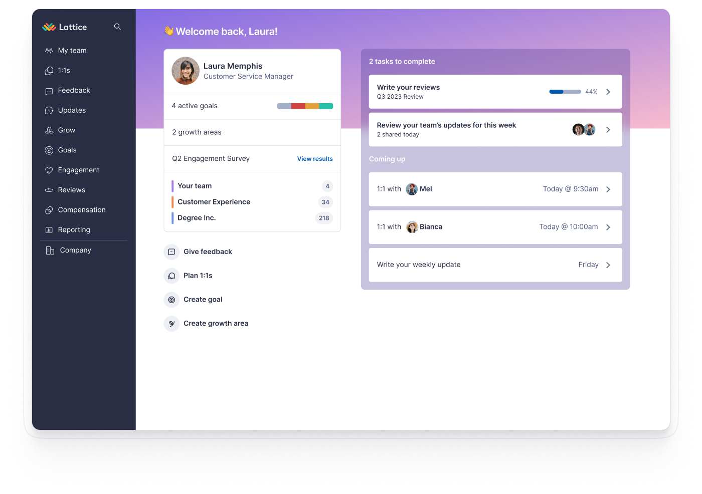 - Avantages : outils d’engagement et de performance sur une seule plateforme, analyses et rapports détaillés pour suivre les tendances d’engagement, fonctionnalités personnalisables qui s’adaptent à une variété de tailles et de structures d’équipe.