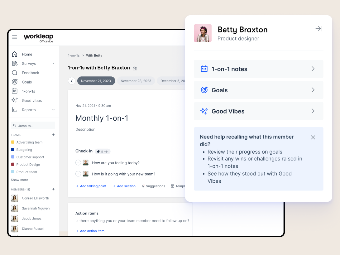 - Principales fonctionnalités : évaluations de performance avec commentaires en temps réel et modèles personnalisés, enquêtes d’engagement et contrôles d’impulsion avec analyses détaillées, ordres du jour de réunions individuelles et mises à jour pour un suivi facile des commentaires