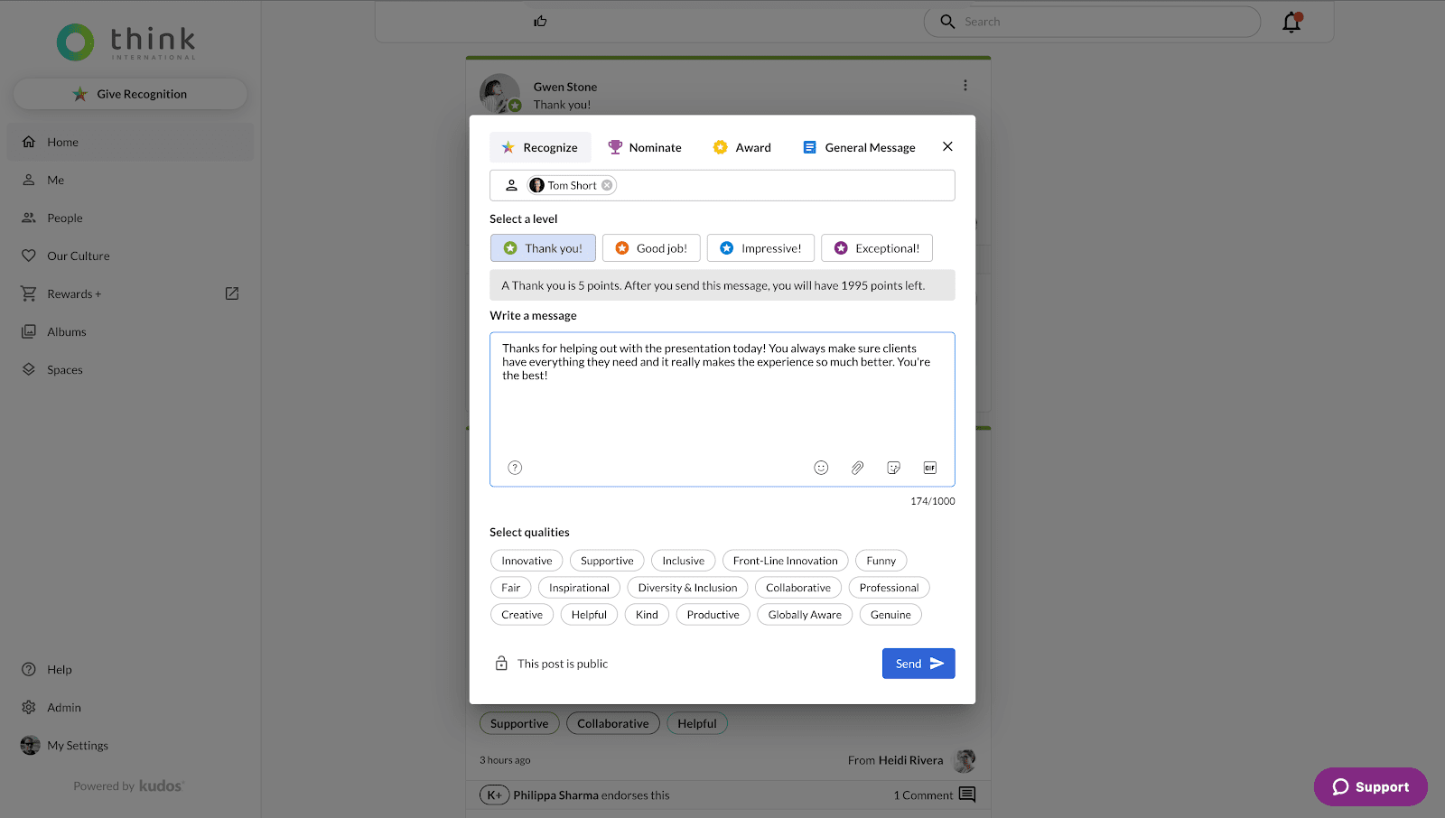 - Principales fonctionnalités : reconnaissance entre pairs avec récompenses et messages personnalisables ; enquêtes d’engagement pour mesurer la satisfaction et le bien-être des employés ; Kudos Wall pour la reconnaissance publique et le renforcement de la communauté.