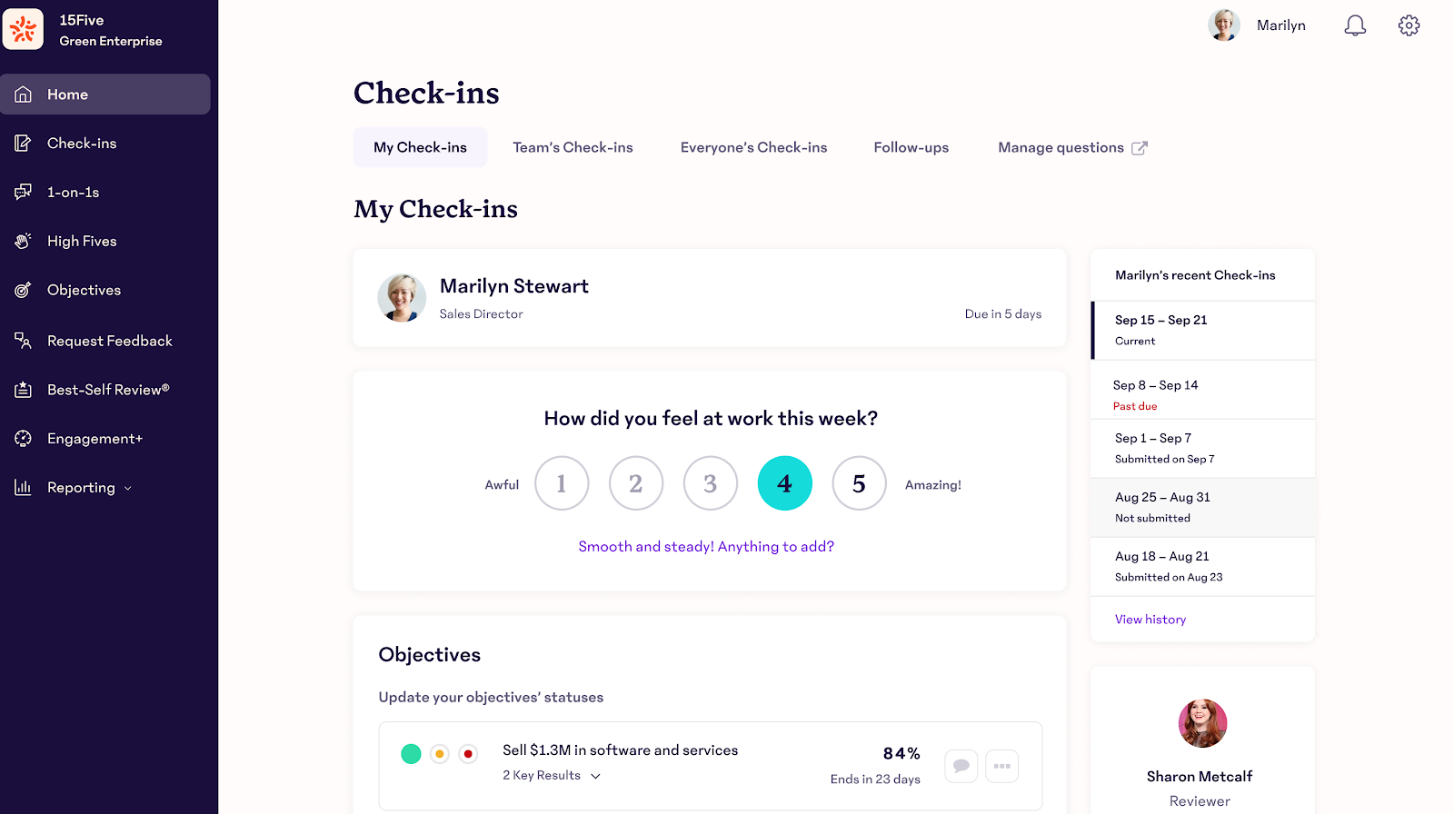 15Five est une plateforme de gestion de la performance conçue pour transformer les données en actions concrètes. En intégrant des outils dédiés aux enquêtes d’engagement, aux plans d’action et au développement personnel, 15Five aide les entreprises à stimuler la croissance et la productivité de leurs employés.