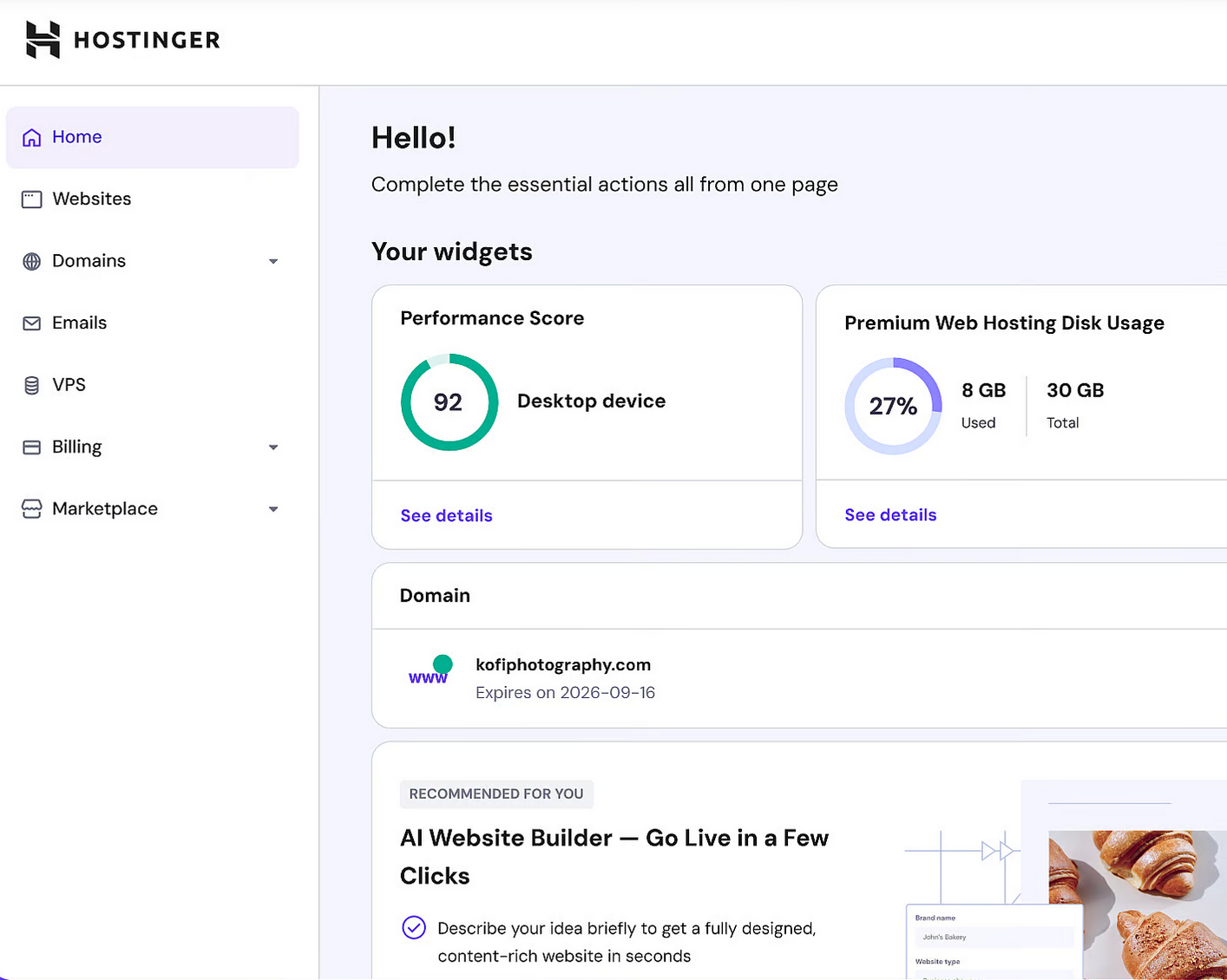 - Convient pour : les utilisateurs à la recherche d’un hébergement web abordable et adapté aux débutants, avec des outils d’IA pour la création de sites web, la génération de contenu et le référencement (SEO).