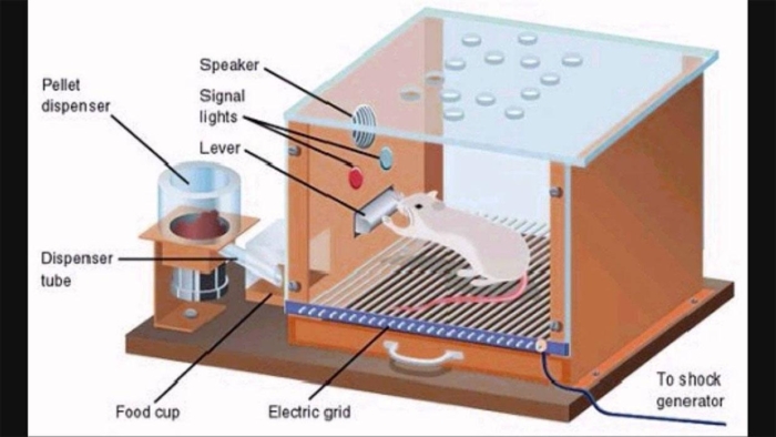 Dans la boîte, un rat a été placé et on lui a donné la possibilité d’appuyer sur le premier levier (qui distribuait de la nourriture ou de l’eau) ou sur le deuxième levier (qui déclenchait des électrochocs dans les pattes). Skinner a découvert que les rats apprendraient très rapidement à appuyer sur le levier nourriture/eau et à éviter le levier qui déclenchait des chocs.