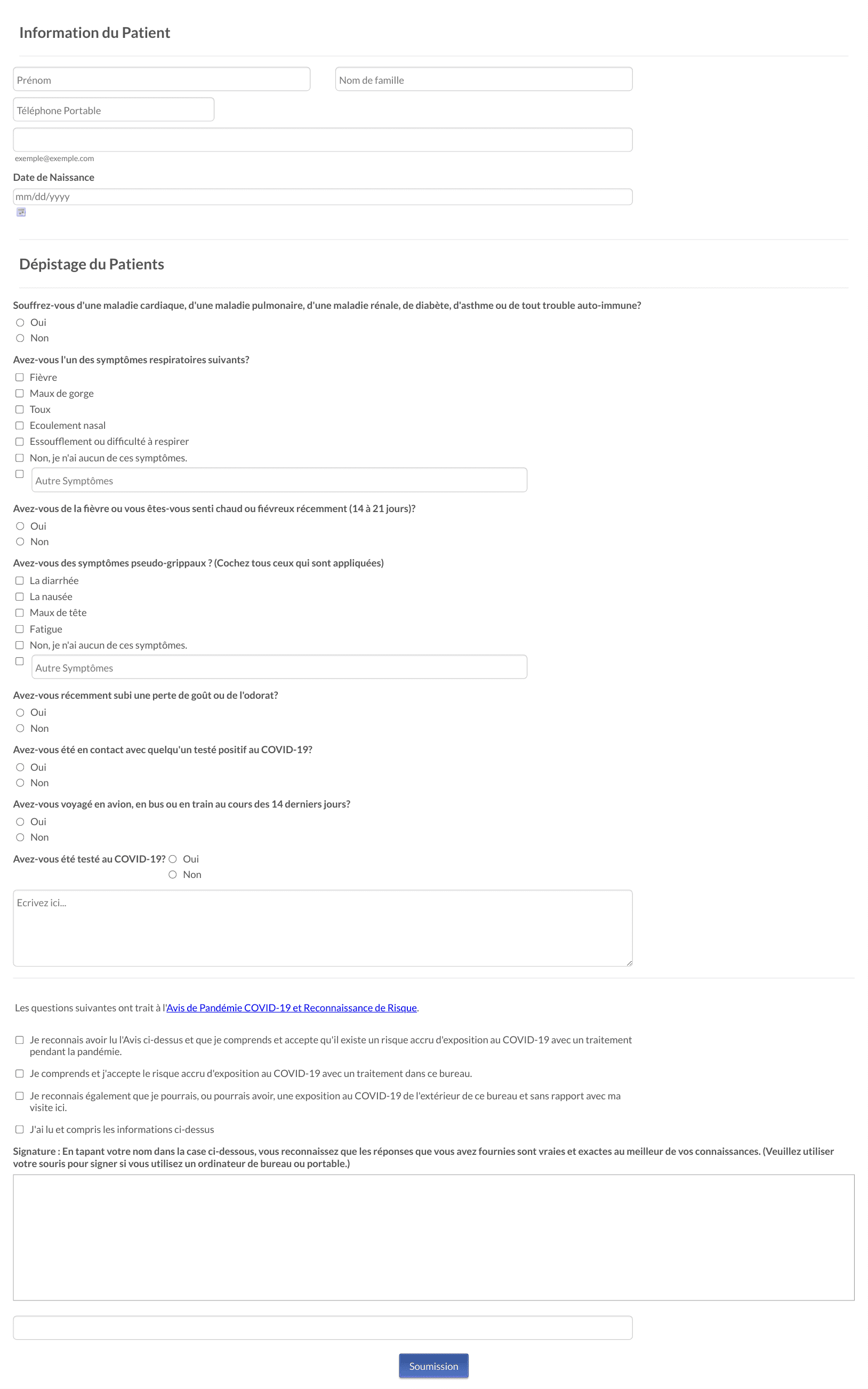 Un test COVID-19 RT-PCR est un test de réaction en chaîne par transcription inverse-polymérase en temps réel qui détecte le coronavirus dans le système respiratoire via un prélèvement nasal. Si votre établissement de santé effectue actuellement des tests sur écouvillon nasal pour détecter et prévenir le coronavirus chez les patients, restez organisé avec notre formulaire de demande de RT-PCR COVID-19 gratuit. Les patients peuvent utiliser n'importe quel appareil pour saisir leurs informations personnelles, décrire la raison pour laquelle ils ont programmé le test et accepter vos directives avec une signature électronique juridiquement contraignante. Les soumissions sont reçues immédiatement et stockées dans votre compte Jotform sécurisé, protégé par la conformité HIPAA avec un plan mis à niveau. Avez-vous besoin que le formulaire de demande COVID-19 RT-PCR en fasse plus pour vous? Pas de problème - utilisez simplement notre Générateur de formulaires par glisser-déposer pour apporter les modifications nécessaires. Personnalisez le formulaire de demande en ajoutant plus de champs de formulaire ou un calendrier de rendez-vous, en modifiant la mise en page et la conception, en modifiant les termes et conditions, et même en incluant votre logo. Vous pouvez également l'intégrer à plus de 100 applications pour synchroniser instantanément les soumissions vers des comptes tels que Google Drive, Dropbox, Box ou Airtable. Gérez facilement et sans contact les demandes de test de coronavirus avec un formulaire de demande de RT-PCR COVID-19 en ligne efficace.