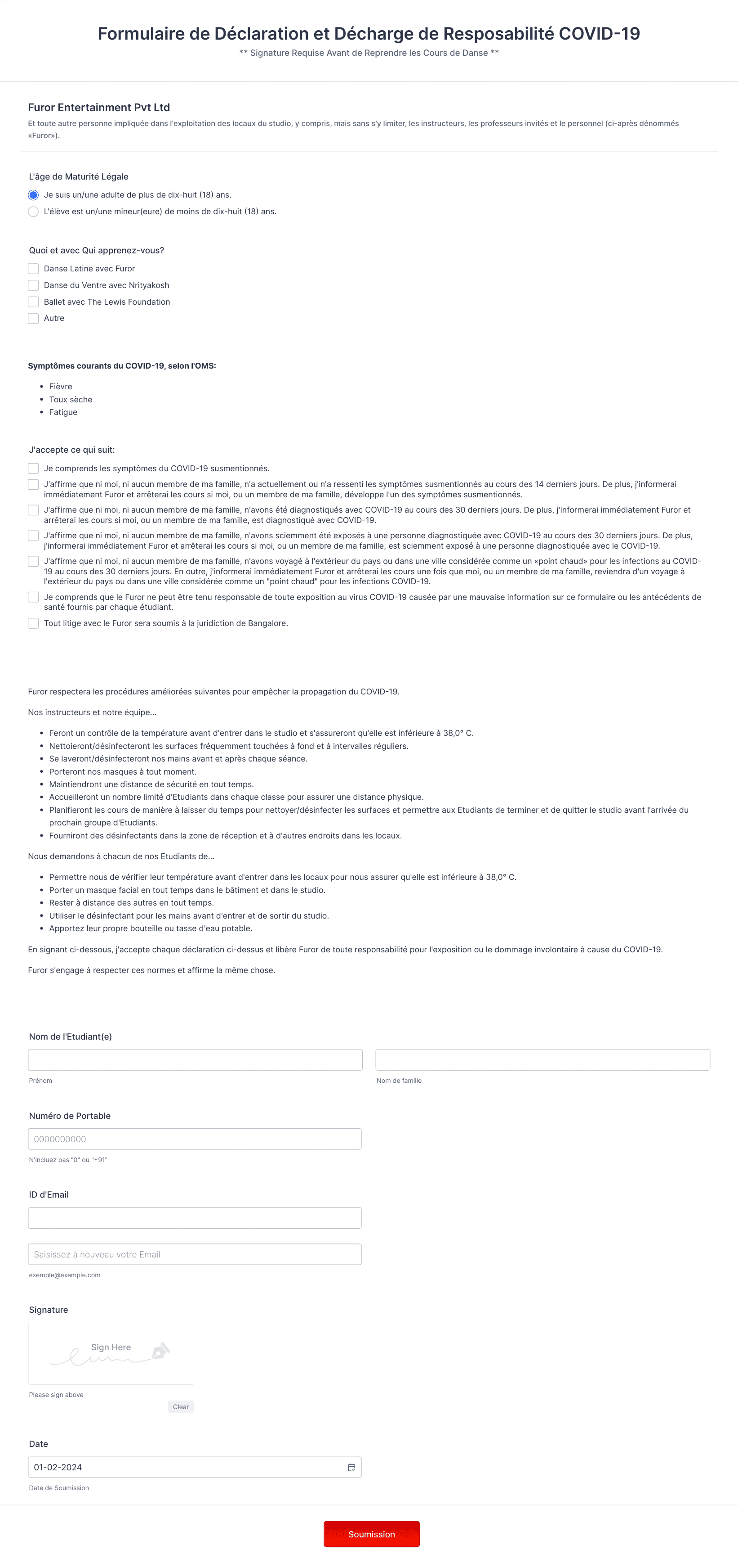 Le Formulaire de Décharge de Responsabilité COVID-19 donne le consentement des patients pour accepter chaque déclaration et décharge de toute responsabilité pour l'exposition involontaire ou les dommages dus au COVID-19.